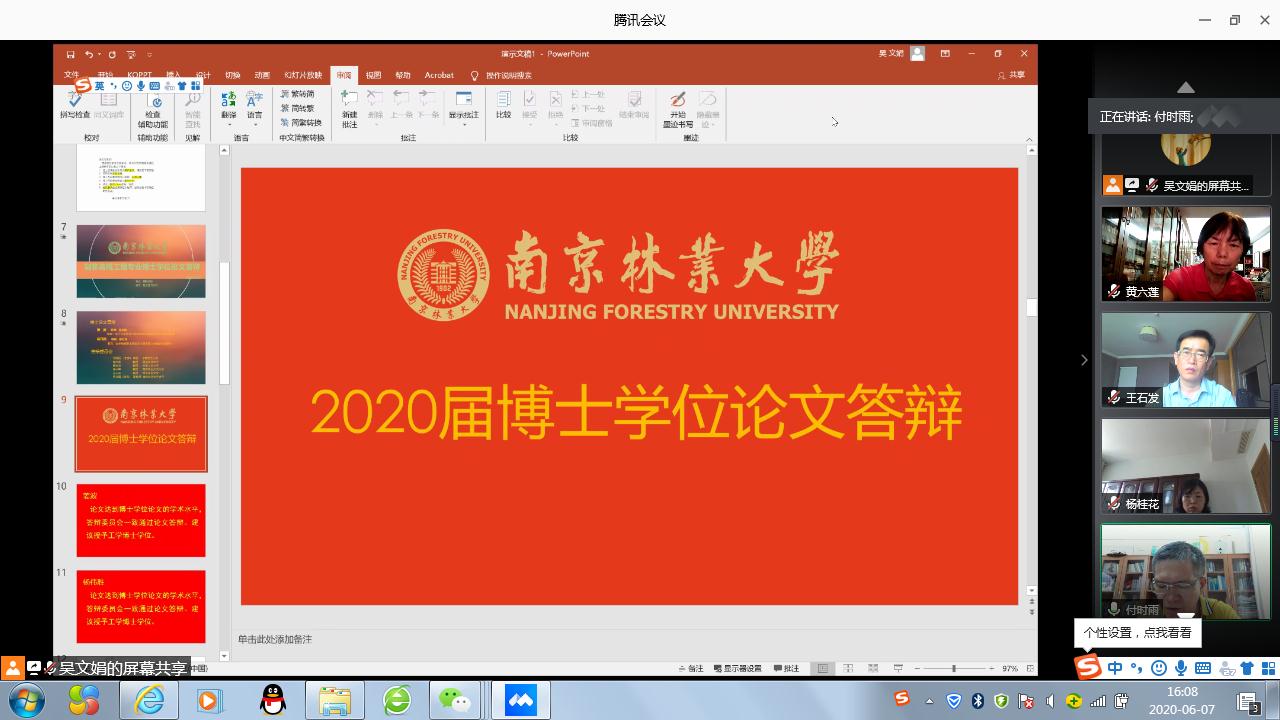 蔡慧等5位学位申请人汇报了各自的学位论文工作,积极听取答辩委员的意见、并逐一认真回答了他们提出的问题。汇报结束后,答辩人及旁听人员退出线上会议,答辩委员会召开专门会议对论文决议并进行网络无记名投票。最后,答辩委员会主席向全体参会人员宣读答辩委员会决议,宣布蔡慧等5位同学通过论文答辩,一致建议授予制浆造纸工程专业工学博士学位,并向他们表示祝贺。